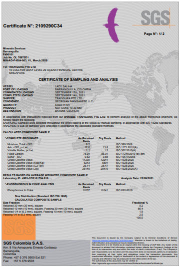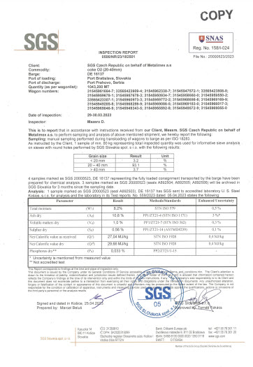 | Gross calorific value in moist ash free (Qsaf): | min 5850 kcal/kg, typical 6375 kcal/kg |